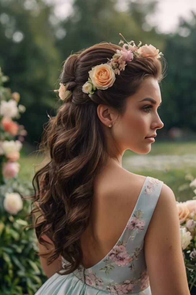 This hairstyle combines volume at the crown with cascading brunette waves. It’s a versatile option that works well for daytime events or evening soirées.