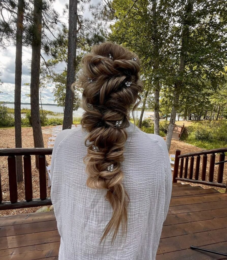 Elegant light brown twisted updo, embellished with sparkling clips, offers a sophisticated option for Beach Hairstyles, particularly for beach weddings or evening events. The twists create volume and texture, while the scattered clips add a touch of glamour that catches the light beautifully. This style keeps the hair neatly secured while still looking stylish and appropriate for a special beach occasion.