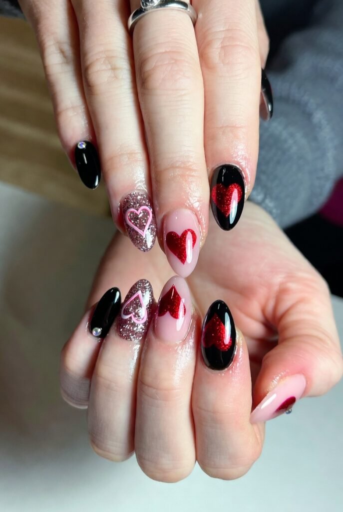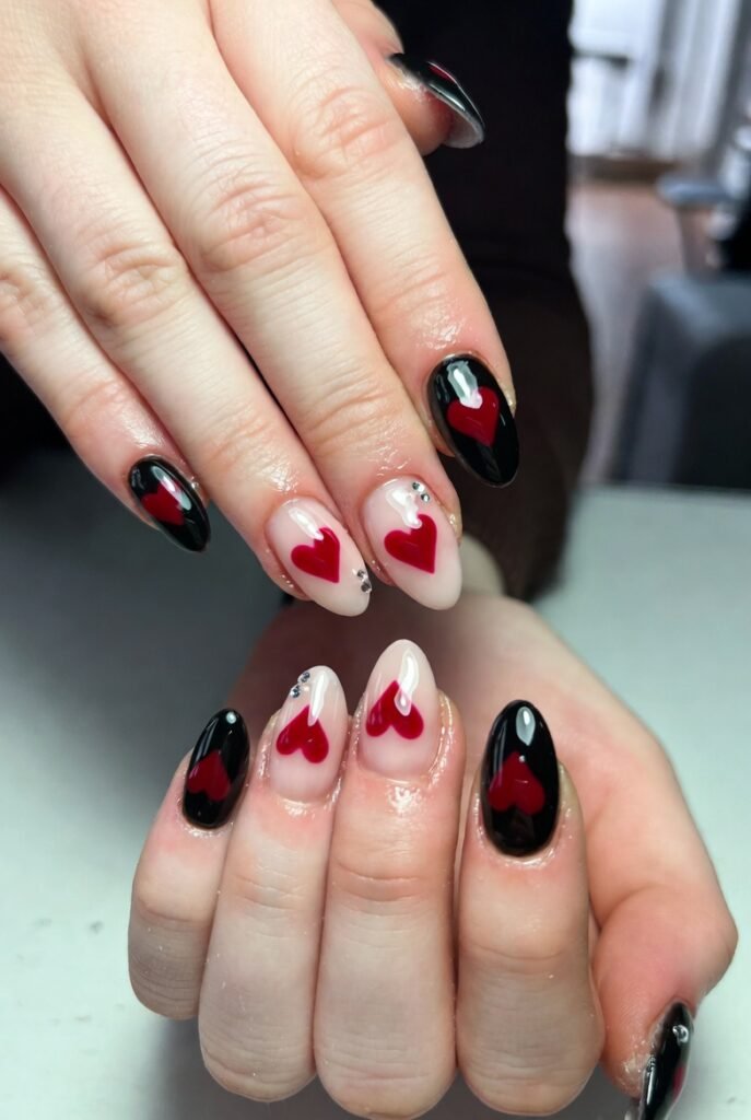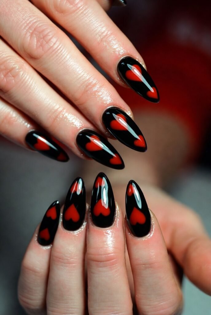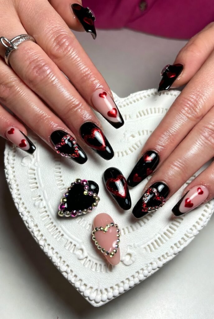 25 beautiful black Valentine’s Day nails inspo embrace the season’s depth—mysterious, passionate, and utterly captivating. Black isn’t absence of color; it’s the perfect canvas for love’s sparkle. Choose chrome for shine, velvet for texture, or hearts for sweetness—and let your nails tell the story of a love that’s bold and beautiful. This Valentine’s, go dark—and watch the romance ignite.