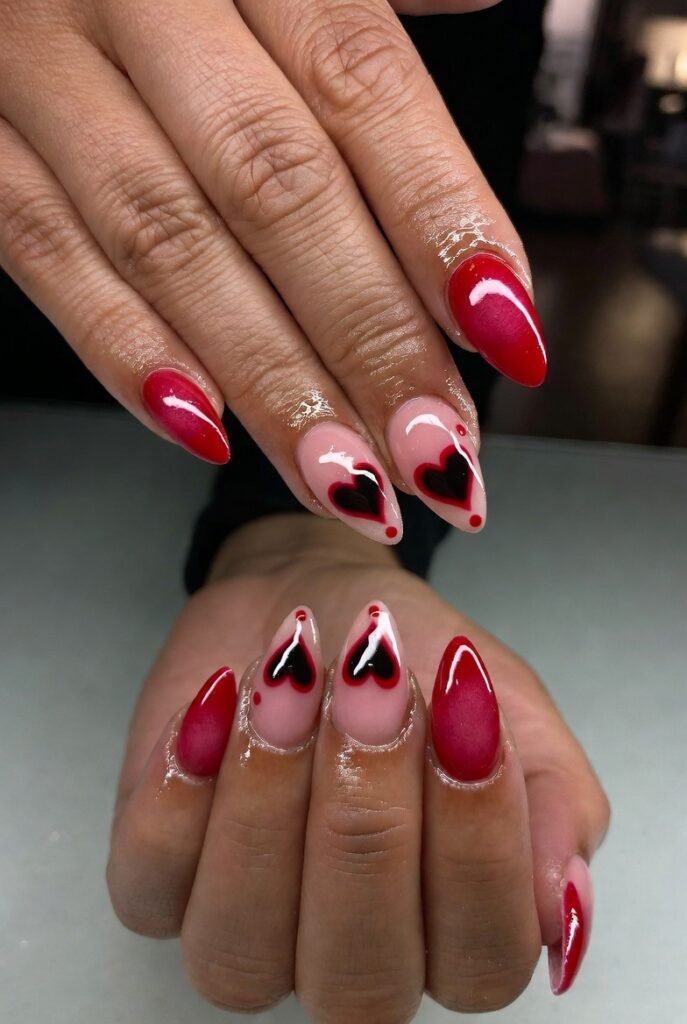 Black nails have always had an edge, but for Valentine’s 2025, they’ve gone full romance. Influenced by gothic revival and quiet luxury trends, black provides the perfect backdrop for hearts, glitter, and metallic accents without feeling juvenile. It’s versatile: matte black reads mysterious, glossy black screams glamour, chrome black catches every light like liquid metal. Sustainability plays a role too—many opt for non-toxic black polishes or press-ons to reduce waste. Black Valentine’s nails photograph dramatically under candlelight or phone flash, making them ideal for date-night selfies. They’re also surprisingly flattering on all skin tones and nail lengths, from short squares to long almonds.