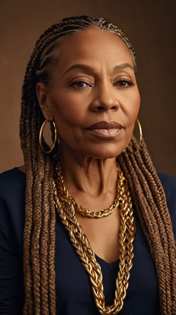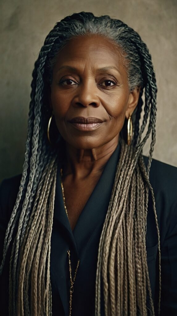 Box braids remain one of the most versatile and protective styles for older Black women. These braids are sectioned into small square parts and braided from the roots to the ends, either using natural hair or extensions.