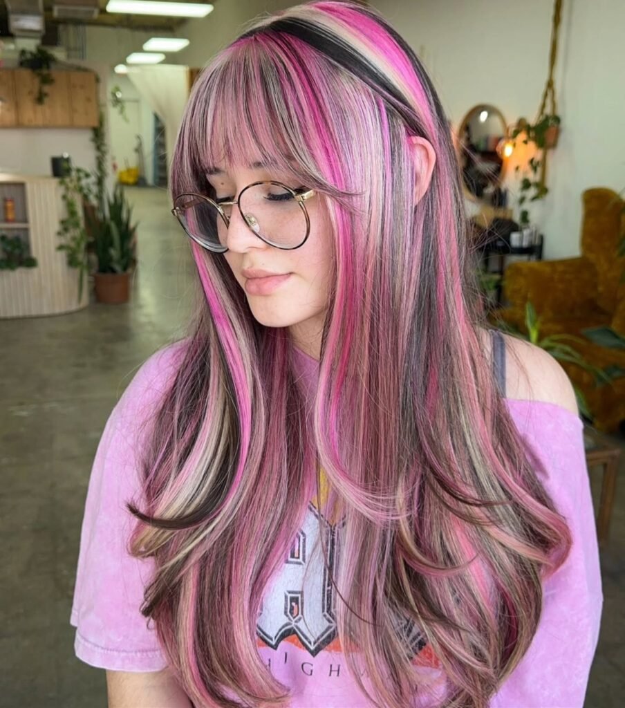 A striking example of Chunky Highlights Hairstyles is presented in this image. Notice the deliberate placement and thickness of the pink, black, and blonde sections throughout the long hair. These bold strands add significant texture and visual interest, creating a dynamic and fashionable appearance. The style is further enhanced by the face-framing fringe and the overall smooth finish of the hair.