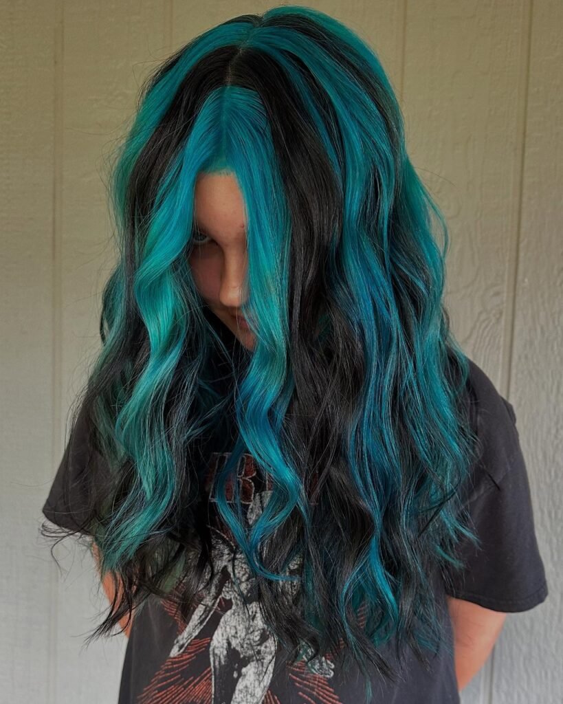 10. Teal and Black Chunky Highlights on Wavy Hair