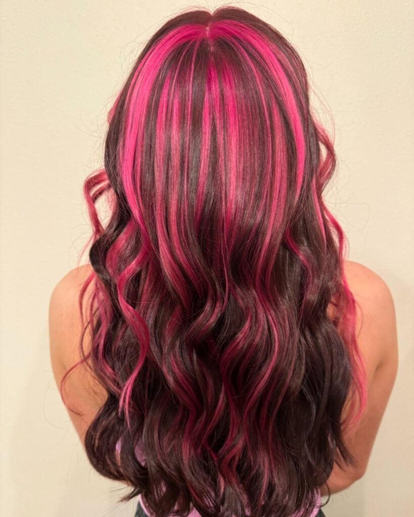 Thick streaks of hot pink are boldly contrasted with a deep, dark brown base, creating a dynamic and eye-catching look. The placement of the chunky highlights emphasizes the flowing waves and adds significant depth and dimension to the overall hairstyle. This technique allows the bright pink to pop dramatically against the dark brown.