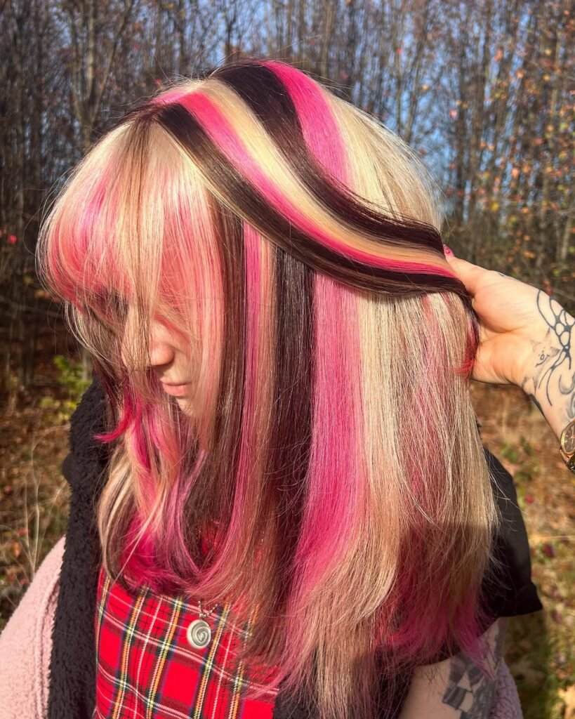 Thick strands of vibrant pink, light blonde, and warm brown are applied throughout the long, layered hair, creating a bold and dimensional effect. The distinct color blocks add significant visual interest and personality to the style. This technique demonstrates how combining multiple chunky highlight colors can create a unique and fashionable look.