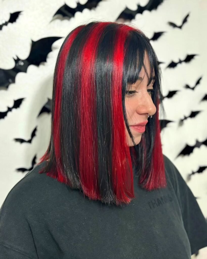 This image showcases a bold and edgy style of Chunky Highlights Hairstyles on a medium-length cut with blunt ends and bangs. Thick, vibrant red highlights are sharply contrasted against a deep black base, creating a striking visual impact. The chunky application is evident throughout the hair, adding significant dimension and a strong statement to the overall look. The blunt cut further emphasizes the bold color blocking.