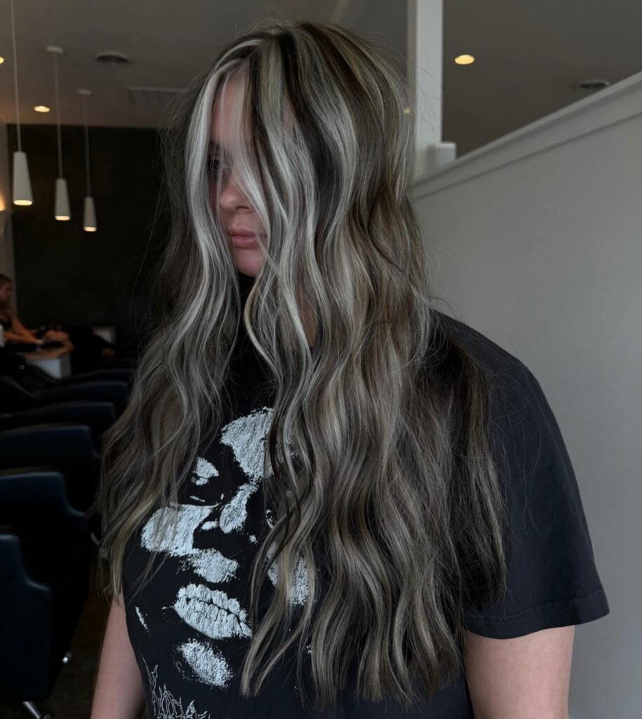 This image presents a cool-toned and textured example of Chunky Highlights Hairstyles. Thick sections of a bright silver are contrasted with a deep, dark ash brown base throughout the long, wavy hair. The chunky highlights are particularly noticeable around the face, creating a bold frame and adding brightness. The overall effect is a high-contrast, edgy, and dimensional hairstyle.