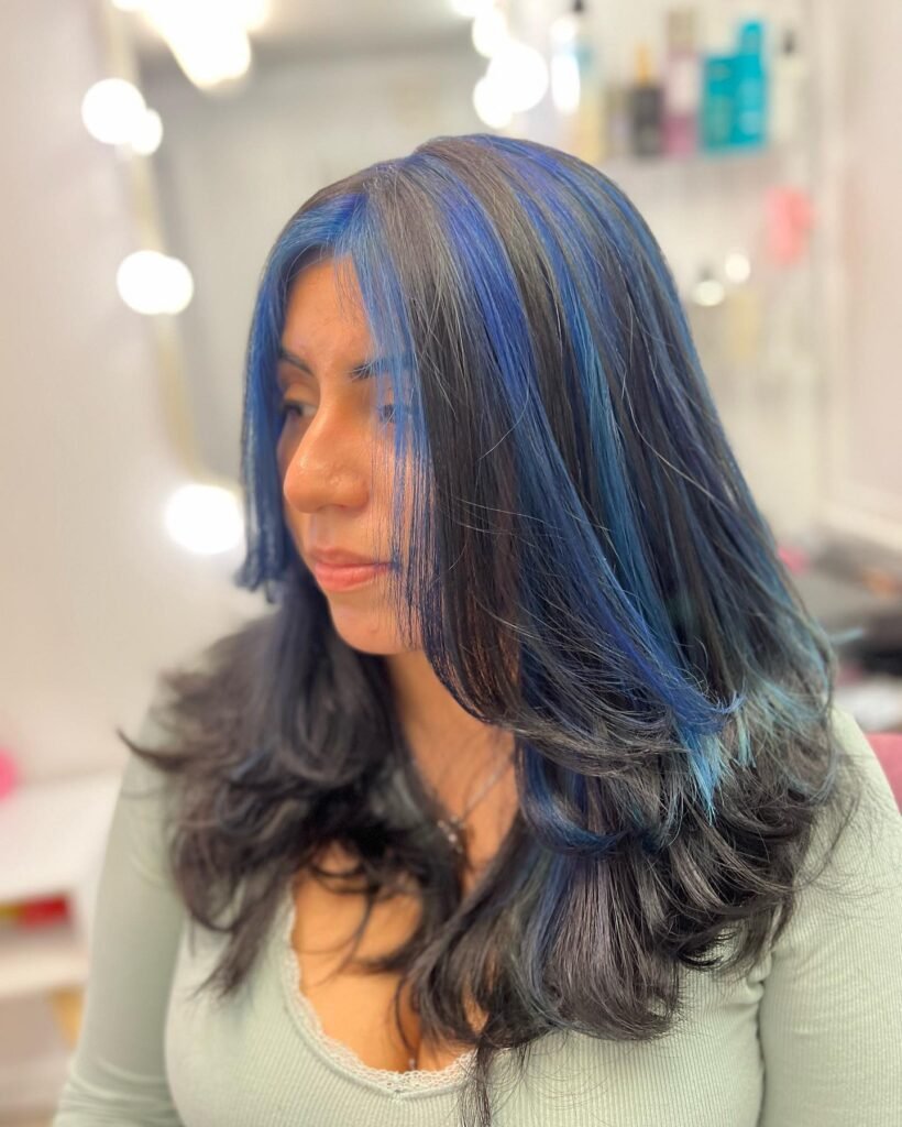 Thick sections of vibrant blue are strategically placed throughout a dark black base, creating a noticeable and fashionable contrast. The chunky highlights frame the face and add dimension to the wavy texture of the lob, resulting in a modern and eye-catching look.