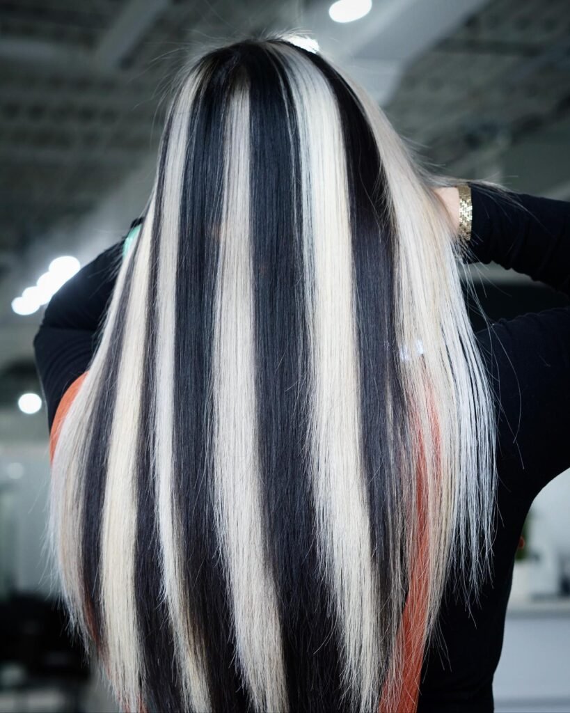 Bold, thick sections of platinum blonde are sharply juxtaposed with deep black strands throughout the long, straight hair. The even distribution of these chunky highlights creates a zebra-like effect, making a strong and fashionable statement. This technique emphasizes the stark contrast between the two colors for a dramatic look.