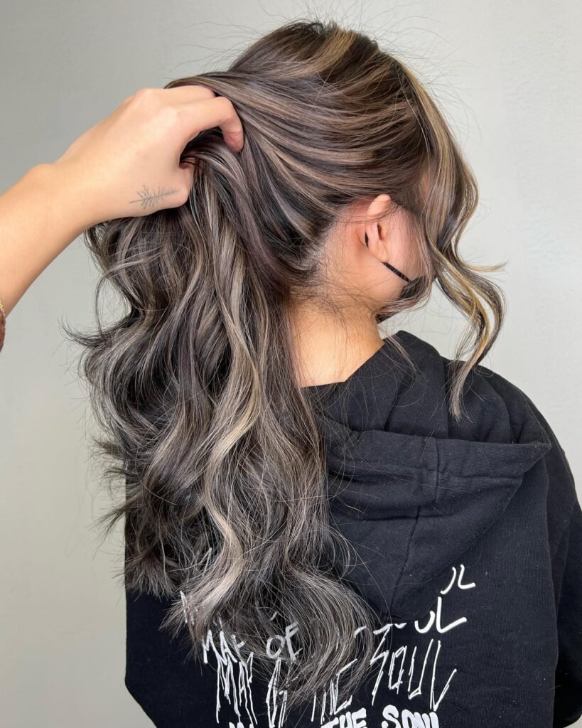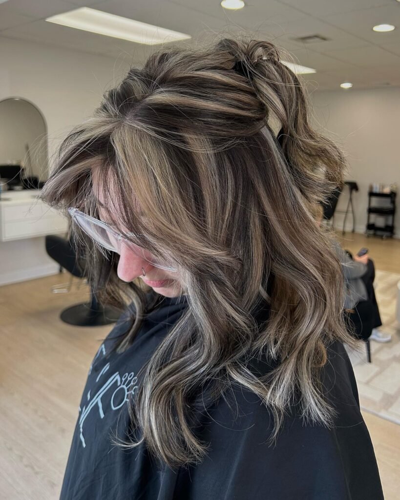 Here’s a look at Chunky Highlights Hairstyles with a focus on blended tones. Thick sections of cool ash blonde are woven through a warm brown base, creating a dimensional effect. The hair is styled in a loose, wavy ponytail, allowing the placement and contrast of the chunky highlights to be clearly visible. This technique adds movement and texture to the hairstyle.