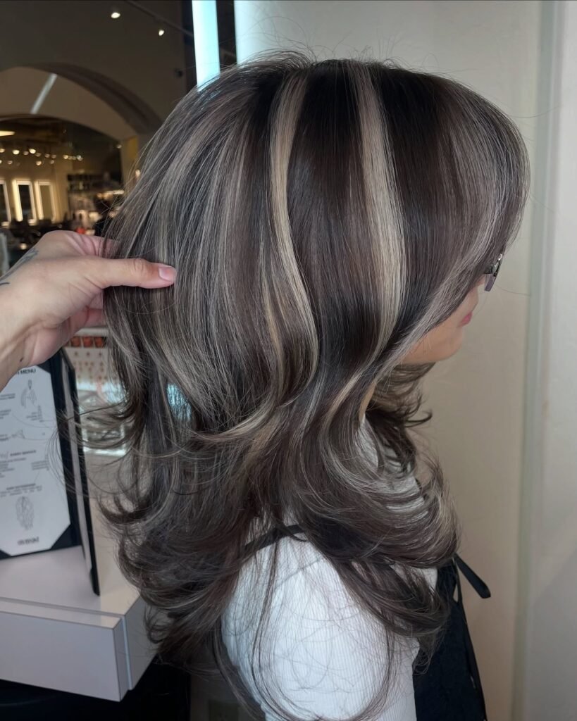 This image showcases a sophisticated take on Chunky Highlights Hairstyles. Thick ribbons of a cool silver blonde are contrasted with a deep, dark brown base, creating a striking visual impact. The chunky highlights are applied throughout the long, layered hair, adding significant dimension and a modern edge to the style. The placement also accentuates the hair’s movement and texture.