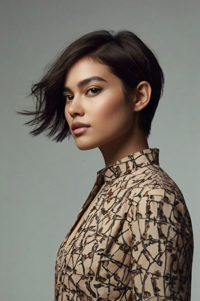 The asymmetrical cut adds a contemporary twist with its uneven lengths. It’s a bold and eye-catching style that works well for oval and heart-shaped faces.