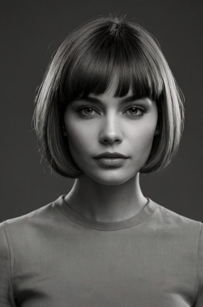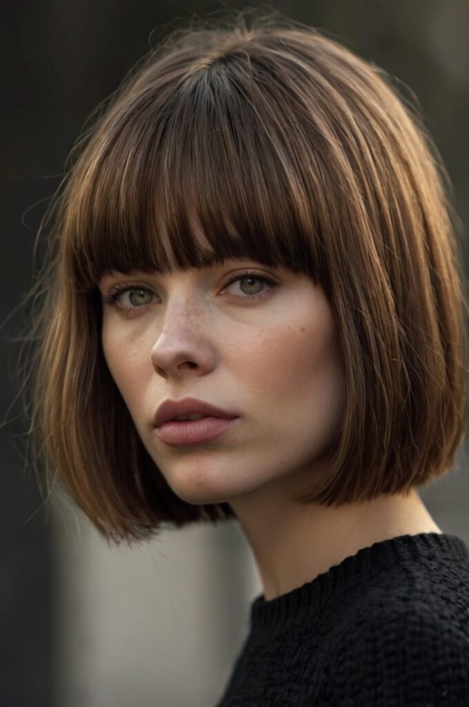 A straight, blunt cut paired with bangs offers a modern and edgy look. This haircut is perfect for highlighting your jawline and cheekbones.