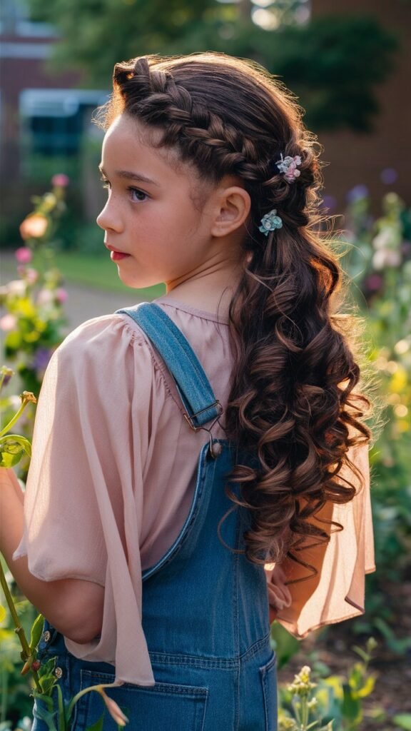 - Styling Tips: Enhance the braid with tiny decorative clips, beads, or flowers. Use a lightweight mousse to keep the curls bouncy. For an extra romantic vibe, pair this look with soft makeup.