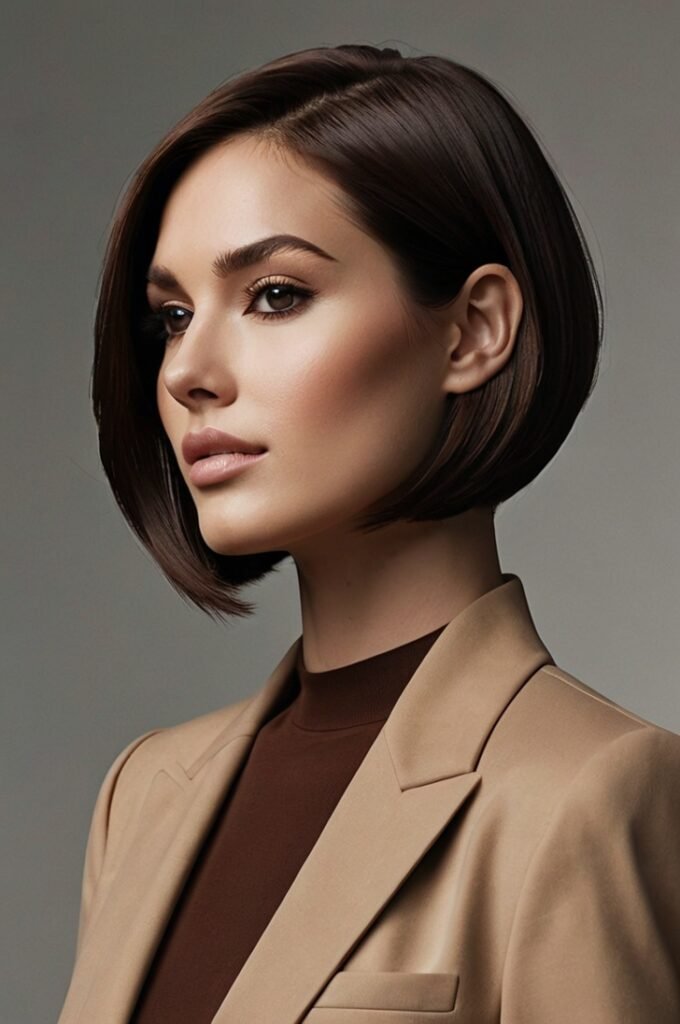 A sleek bob with a deep side part enhances the natural shine of brunette hair, especially in espresso and chocolate tones. This refined style exudes confidence and professionalism, making it perfect for work or formal events. The deep side part adds volume and structure, creating a polished, modern aesthetic.