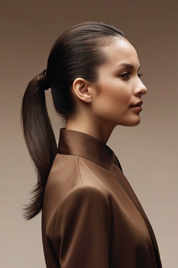 A sleek low ponytail in espresso brown shades gains a stylish twist with a knotted effect at the base. This polished and elegant hairstyle is perfect for work, evening events, or minimalist fashion lovers.