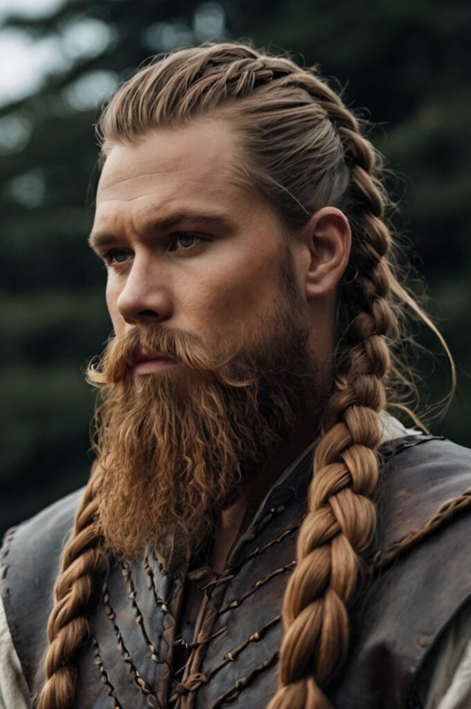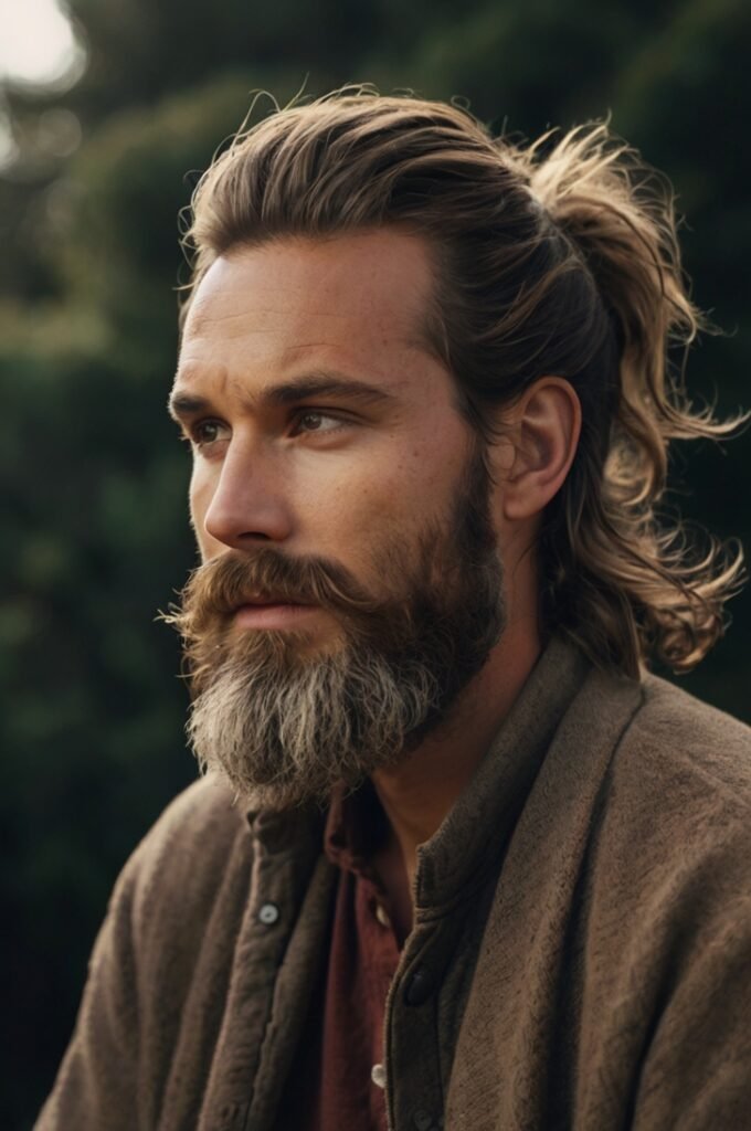 For a bold and edgy appearance, try a braided ponytail combined with a thick Viking-style beard. This look exudes strength and individuality, making it perfect for men who love to stand out.