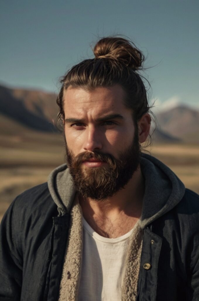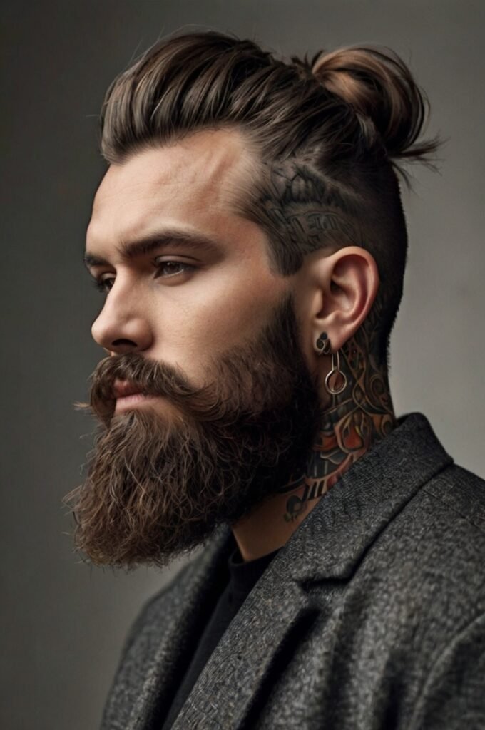 A loose bun paired with a scruffy beard offers a relaxed and rugged charm. This effortless style works well for casual outings and emphasizes a laid-back attitude.