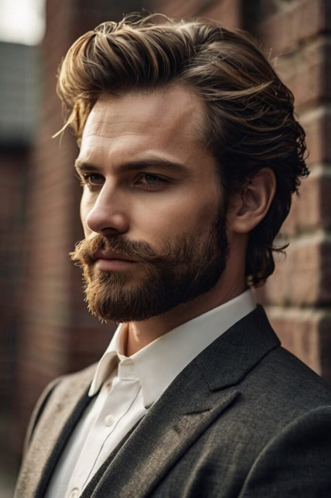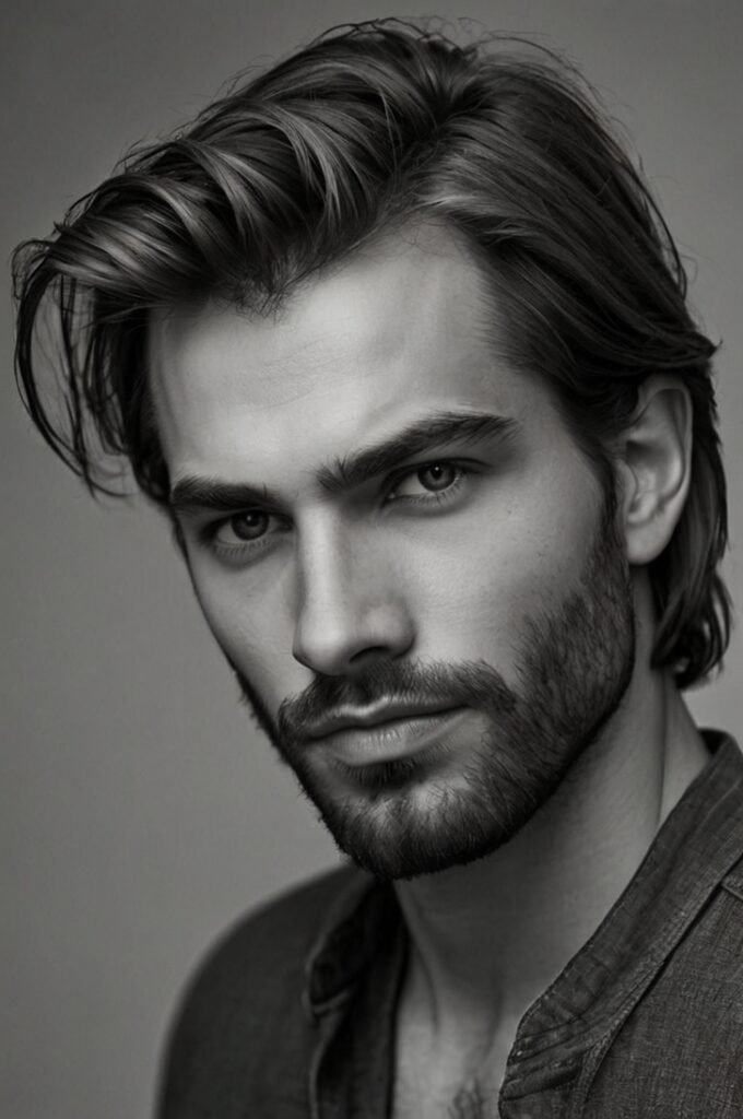 Side-swept hair adds elegance and volume, making it an excellent choice for men with thinner hair. Pair it with a light beard for a balanced and approachable style.