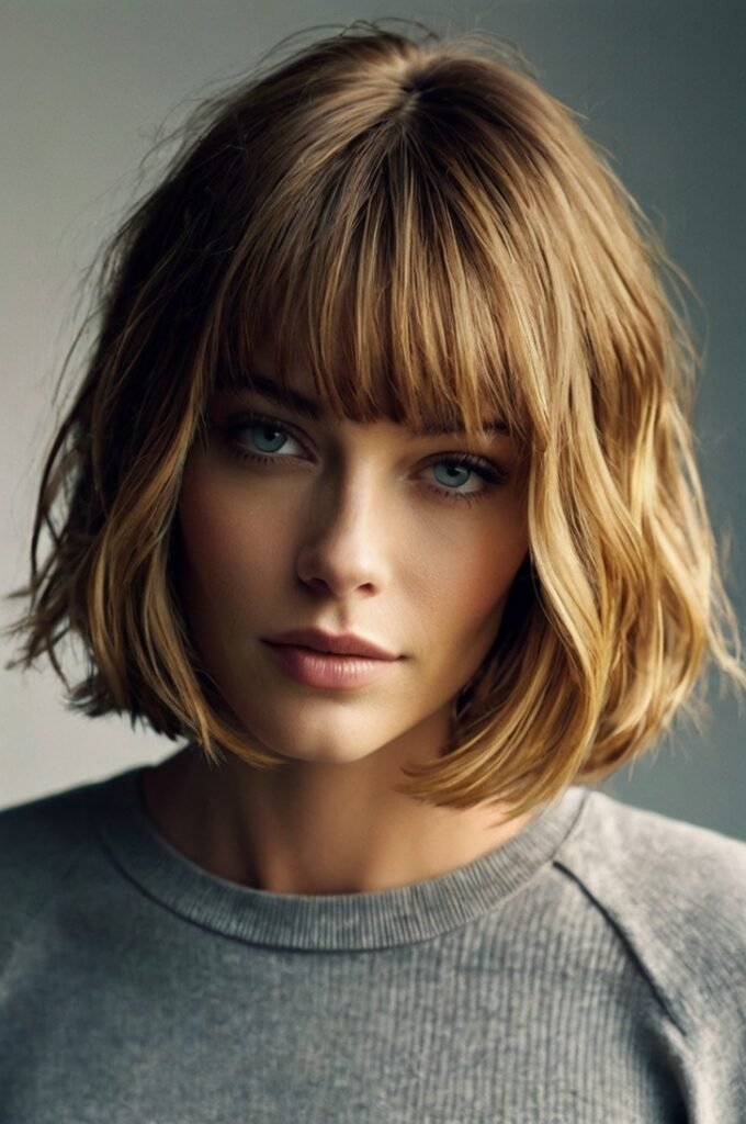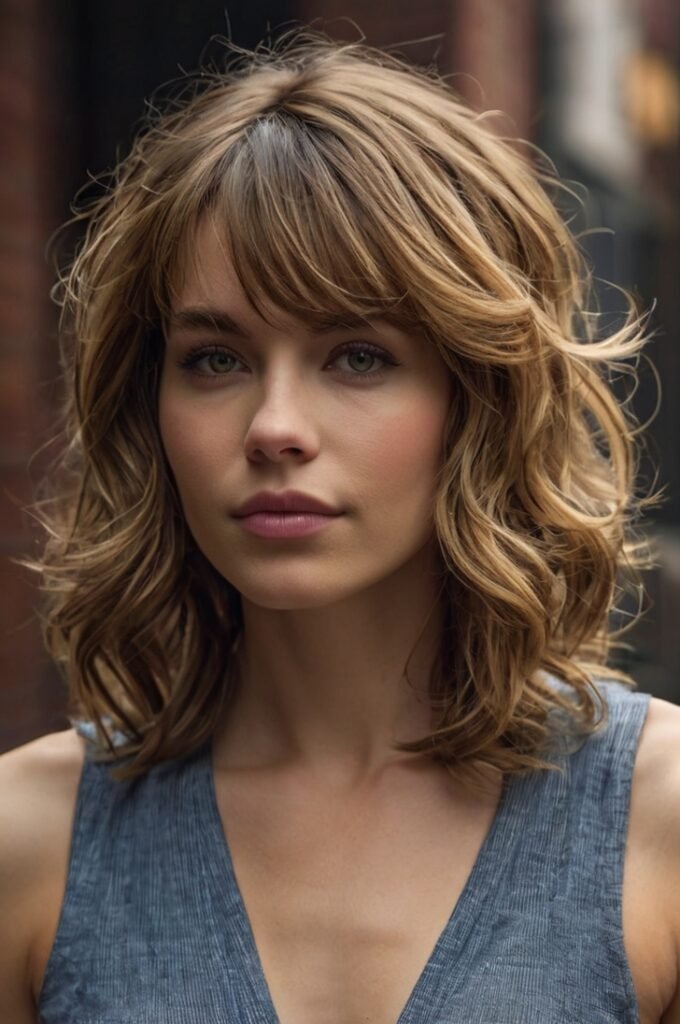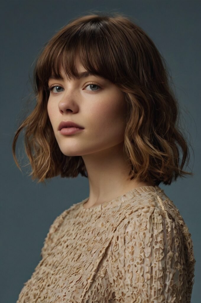 A shoulder-length cut with soft bangs and subtle texture adds volume and movement. This style suits various face shapes and makes thin wavy hair appear effortlessly full.