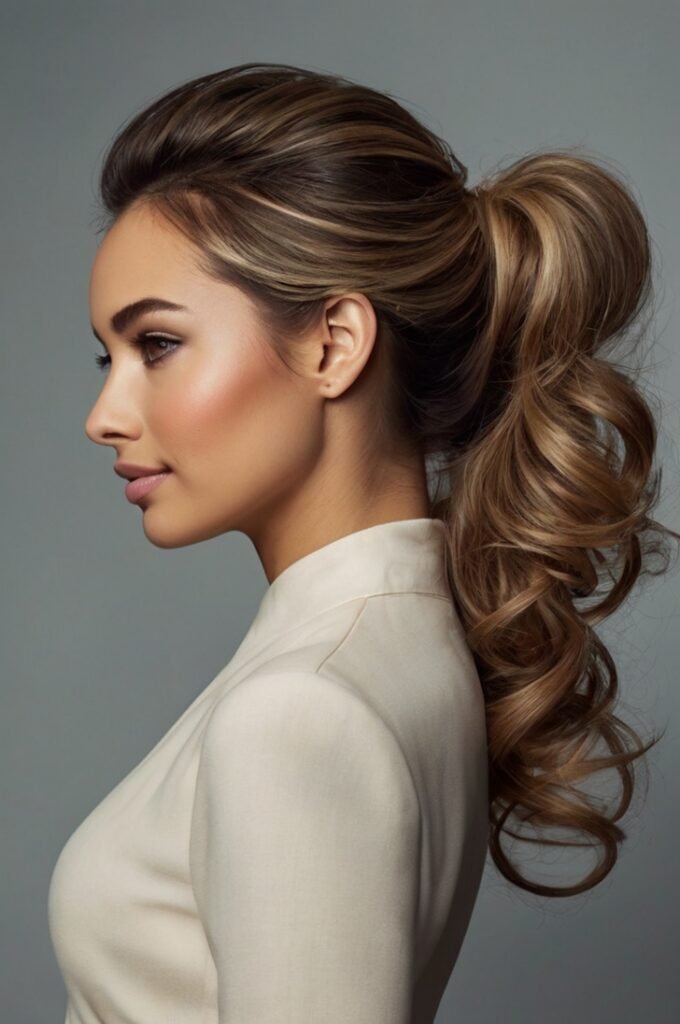 A teased crown and loose waves transform a simple ponytail into a voluminous style. This elegant look is ideal for special occasions and can be easily achieved with backcombing or volumizing products.