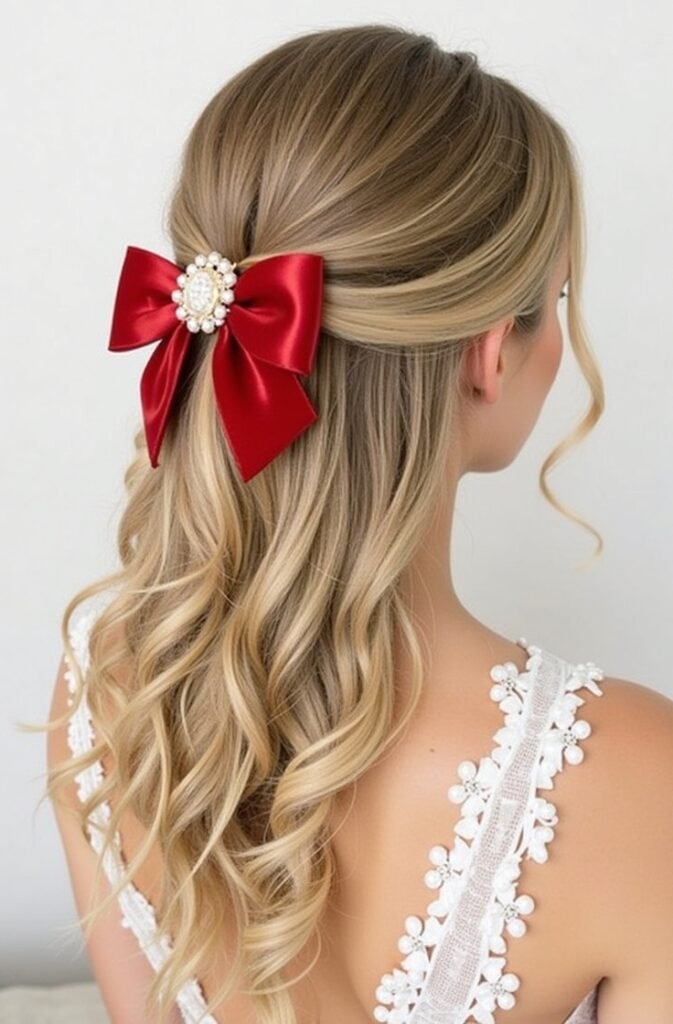 This style works beautifully on curled or voluminous hair, as the bow accentuates the fullness and texture of your locks. The half-up bow barrette look is perfect for anyone who loves to experiment with accessories while maintaining an elegant and timeless feel. Whether you’re aiming for a vintage-inspired look or simply want to add a little extra glam to your hairstyle, this chic and polished style is sure to turn heads.