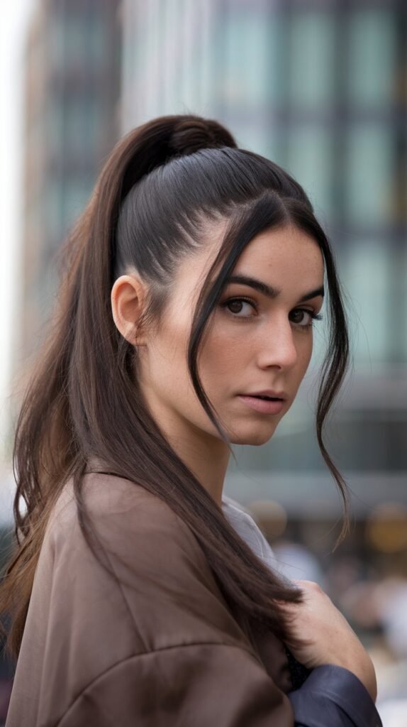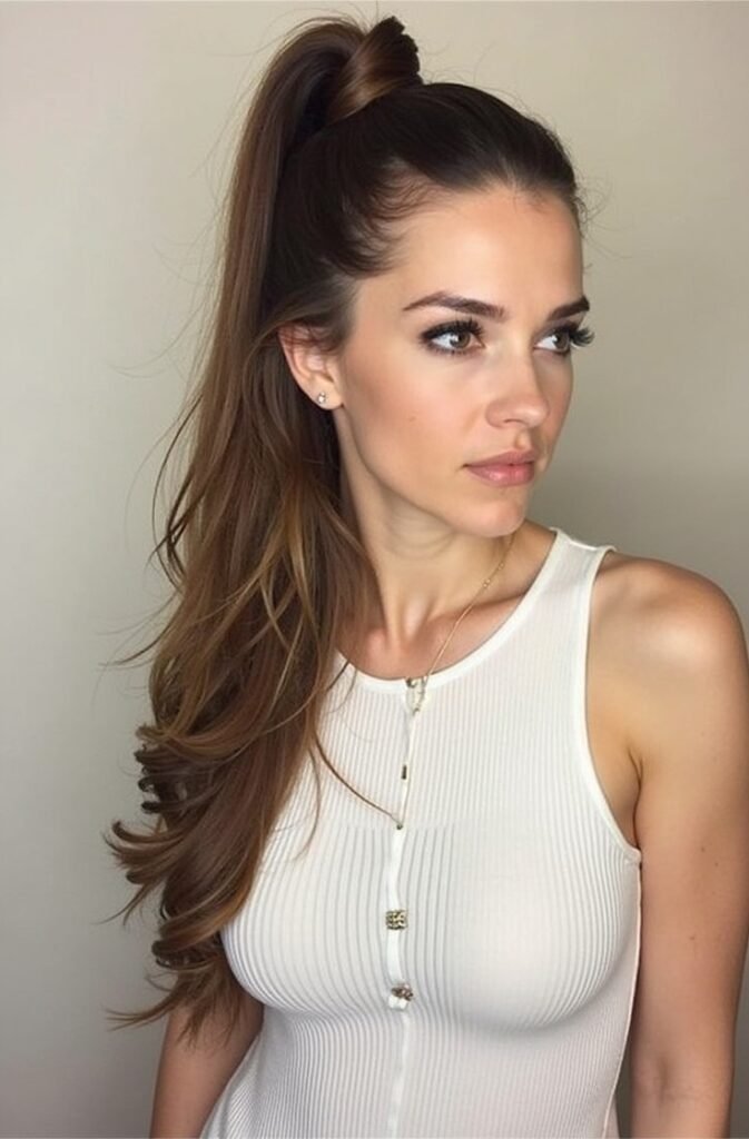 The sleek half-up ponytail, often inspired by celebrities like Ariana Grande, is a bold and polished look that’s perfect for any occasion. This style features a high, tight ponytail secured with the top half of your hair, while the rest flows straight down. It’s a chic and modern take on the classic half-up, half-down look, giving you a polished yet effortless appearance. This sleek ponytail exudes confidence and sophistication, making it an ideal choice for formal events or a night out.