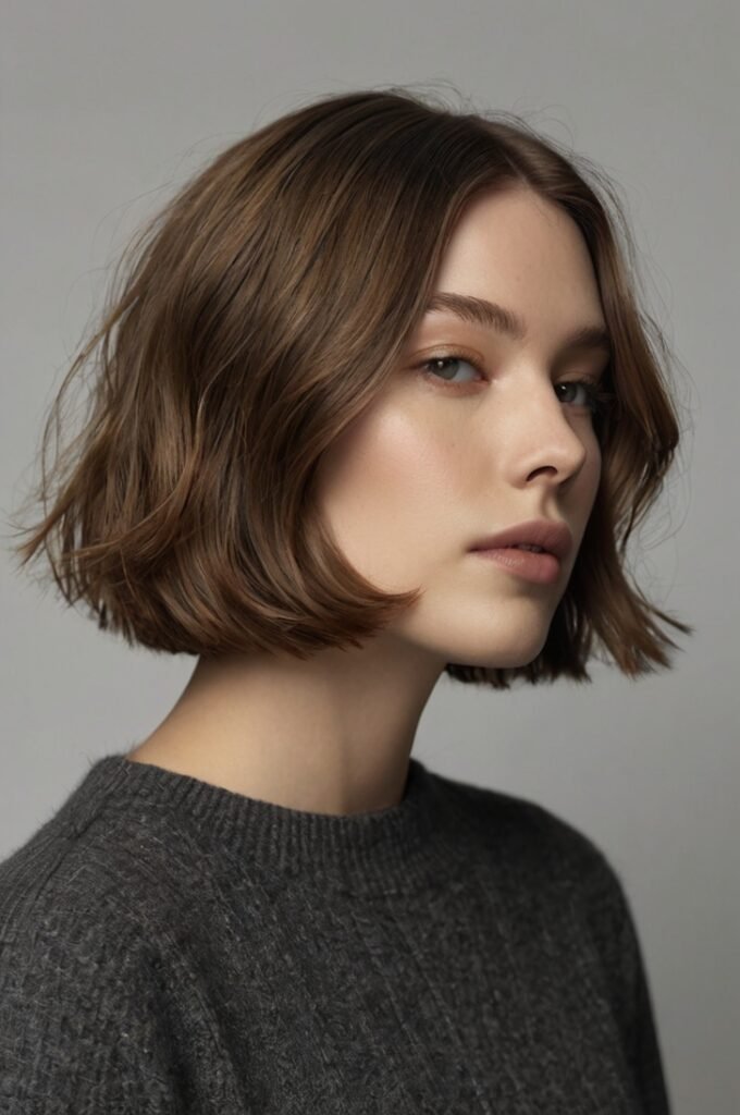 A sleek blunt bob is elevated with soft, tousled waves, giving a modern twist to a classic cut. This style is ideal for women with straight hair who want to add volume and texture.