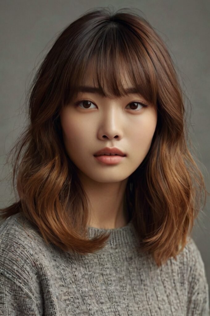 Curtain bangs are a staple in Korean hairstyling. Paired with long, layered hair, they create a soft frame around the face. This style is perfect for women who want a casual, everyday look that remains chic and elegant.