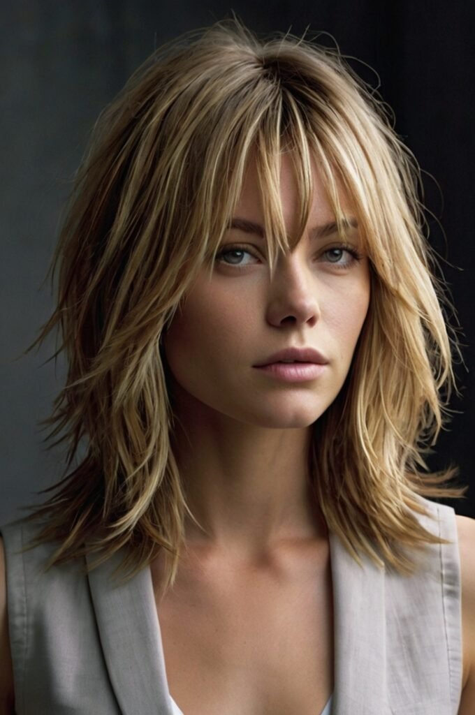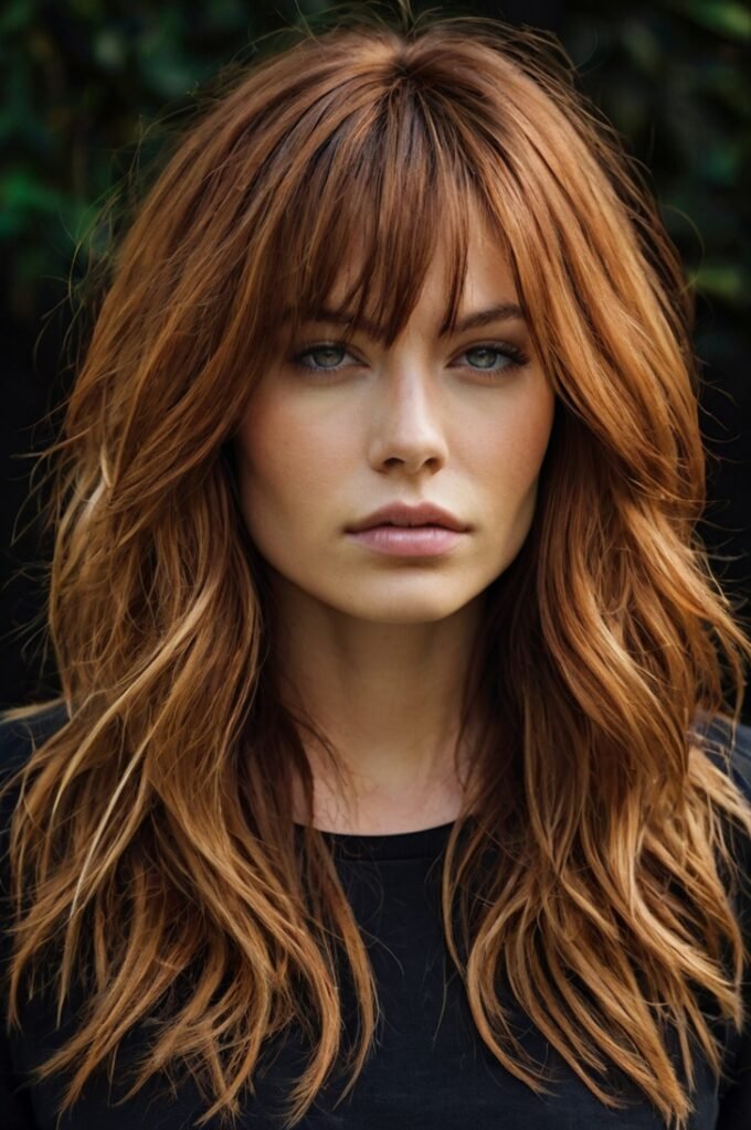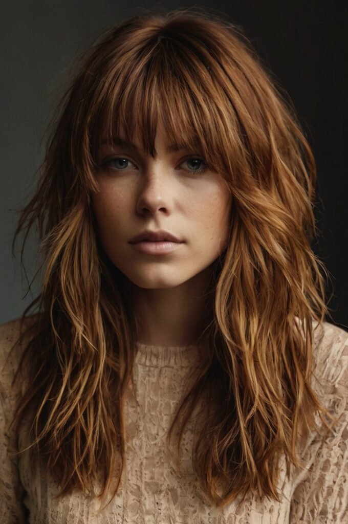 A modern take on the shag cut with longer, textured layers. This edgy yet soft look adds movement and volume while keeping styling easy. Pairs well with warm caramel or soft copper tones for extra dimension.