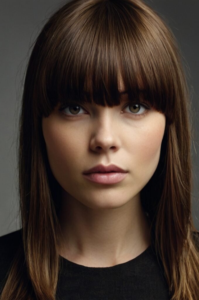 A chic haircut that combines structured bangs with soft layers for contrast. This look is ideal for straight hair, creating a bold yet elegant effect. Try deep espresso or jet black for a sleek, polished appearance.