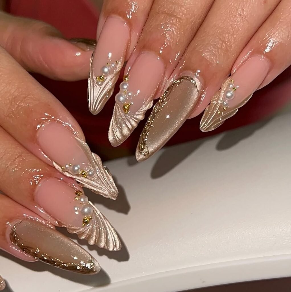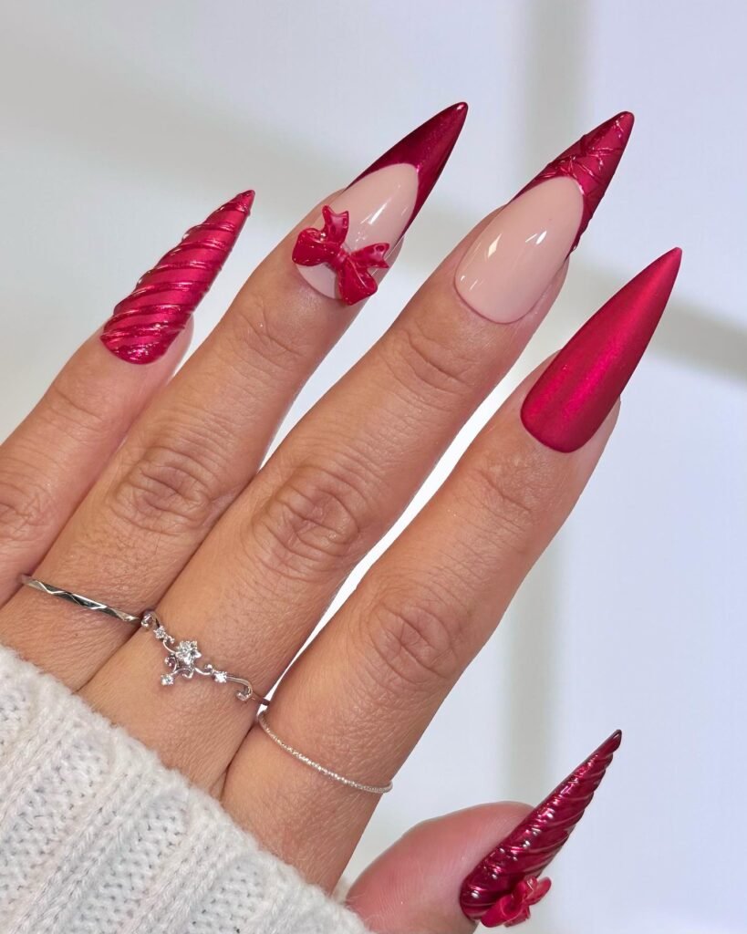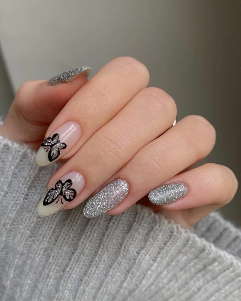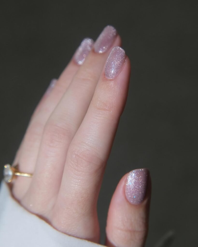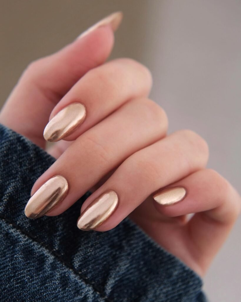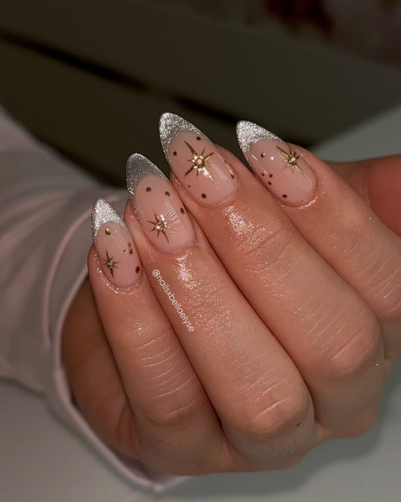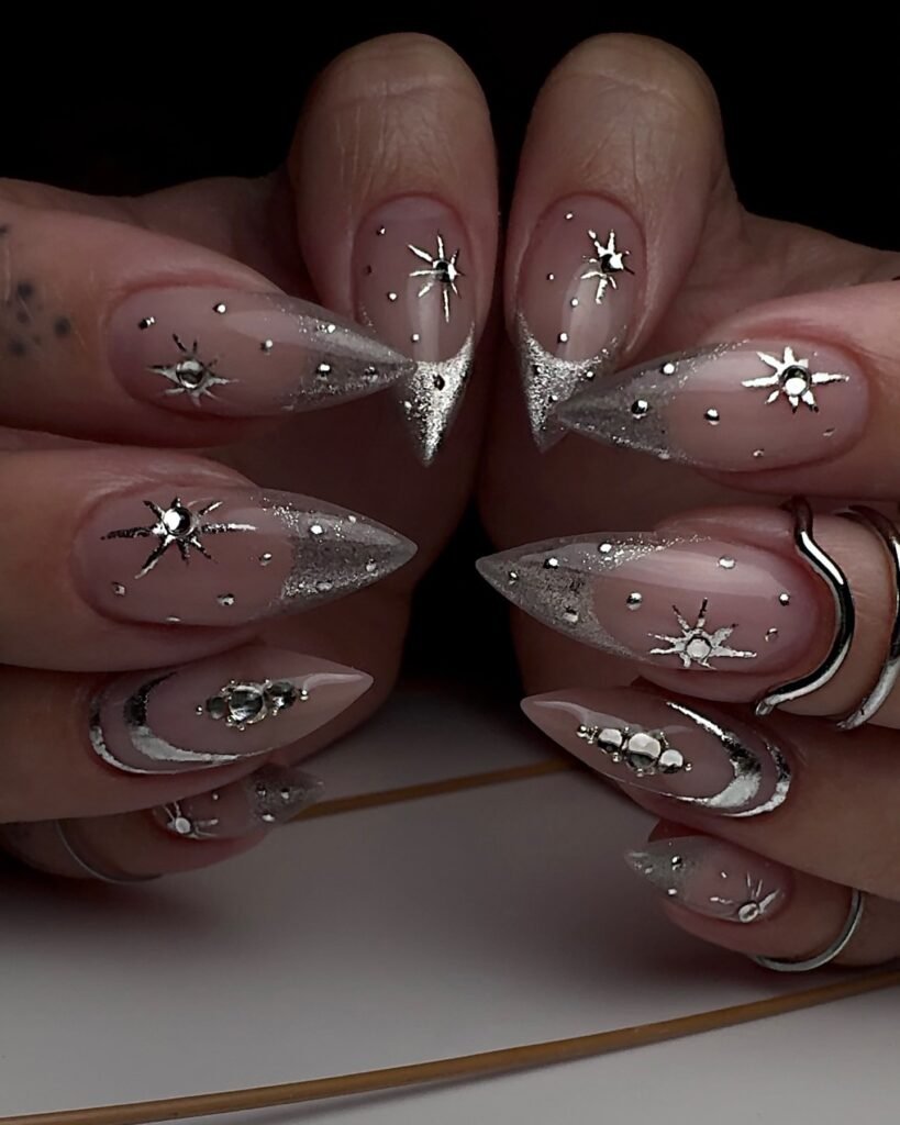 Chrome dominates, with silver and gold leading for reflective drama. Velvet cat-eye adds texture, while glitter French tips modernize classics. Bows and stars nod to coquette and celestial vibes. Sustainable brands offer recycled glitter. Shapes: almond or coffin for drama, short square for practicality.