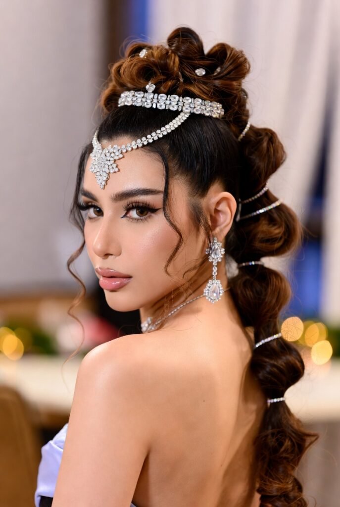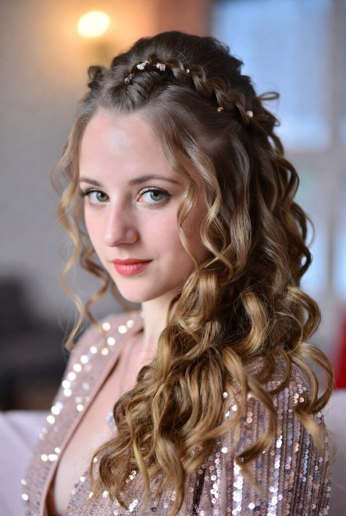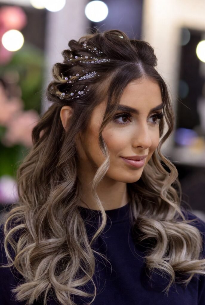 - Half-Up Crystal Waterfall – Top half twisted into a loose knot, bottom left in soft curls, with crystal strands woven through.