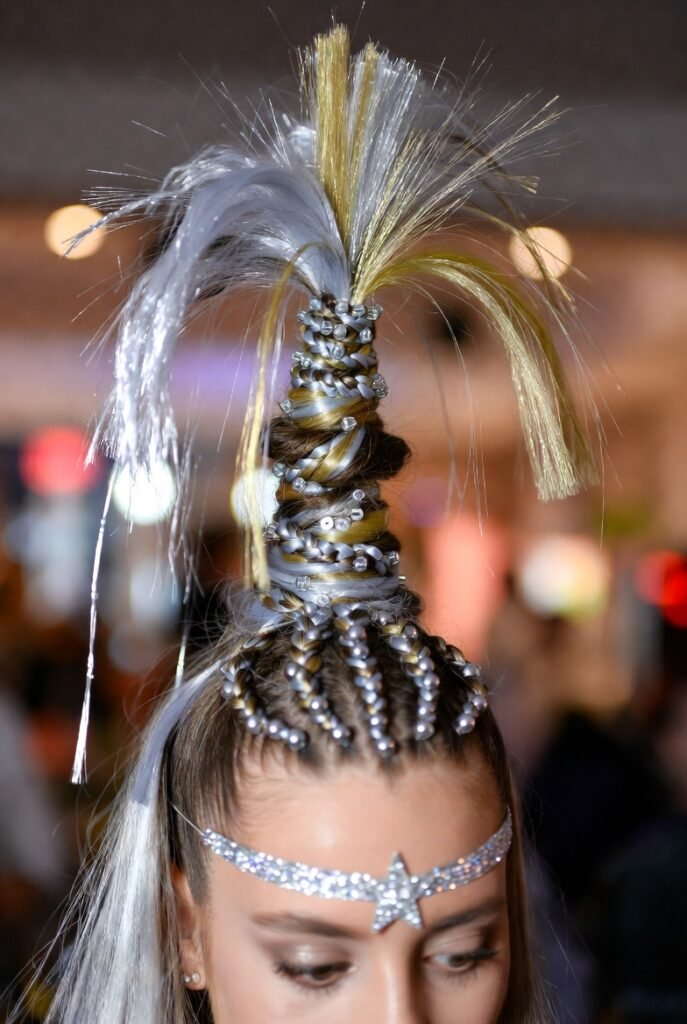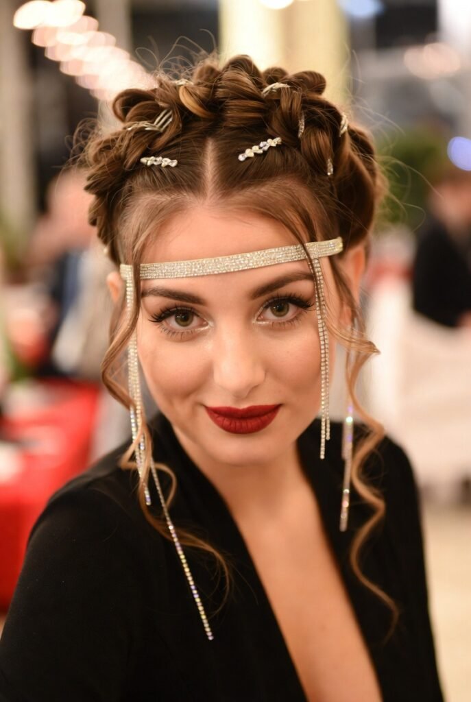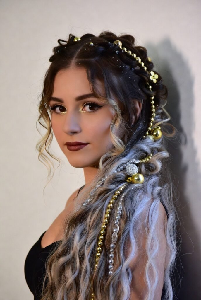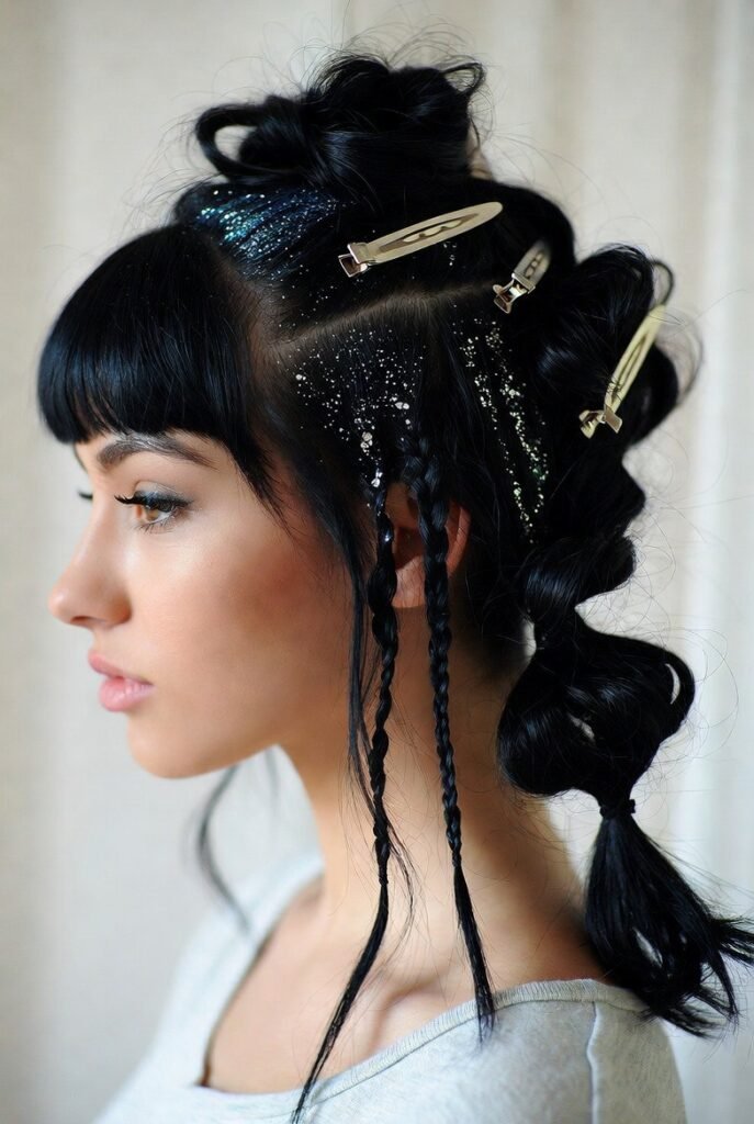 - Double Dutch Braids with Glitter Roots – Two tight braids with silver glitter pressed into the roots—party-ready and headache-free.