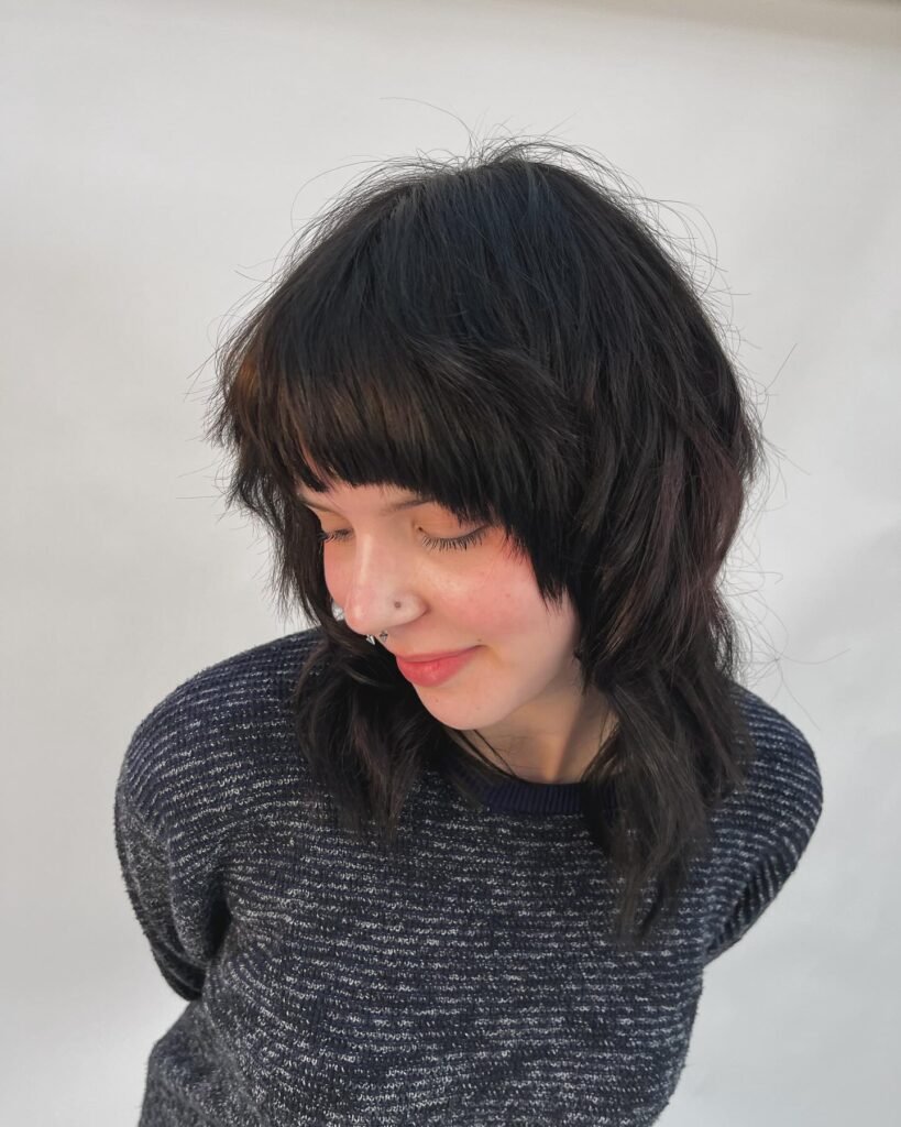 This image highlights a shaggy, dark brown Octopus Cut. The hairstyle features a rich, dark brown color with subtle variations, adding depth. The cut is characterized by its layered texture, with shorter, choppier layers at the crown that provide volume, transitioning into longer, more tousled layers. The addition of bangs frames the face, enhancing the overall shaggy and modern aesthetic of this Octopus Cut.