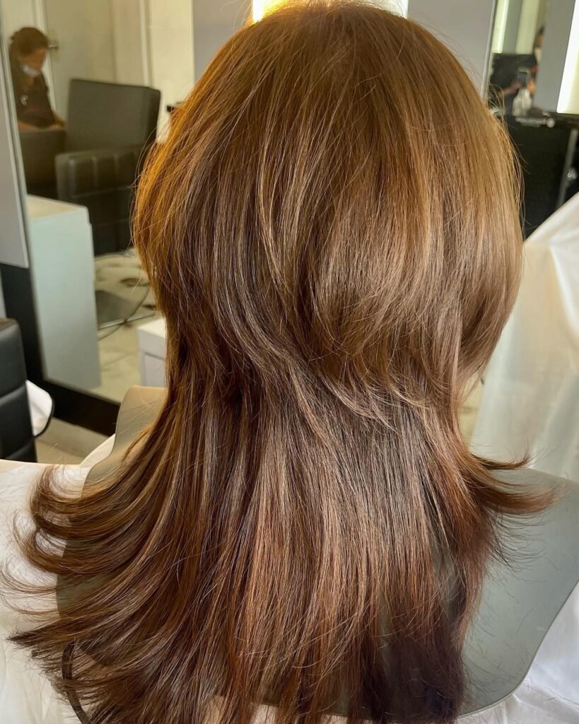 Brown base is enhanced by lighter highlights, adding depth and movement to the hairstyle. The cut features the signature elements of the Octopus Cut, with shorter layers at the crown creating volume and longer layers cascading down. This style offers a soft and elegant take on the modern Octopus Cut.