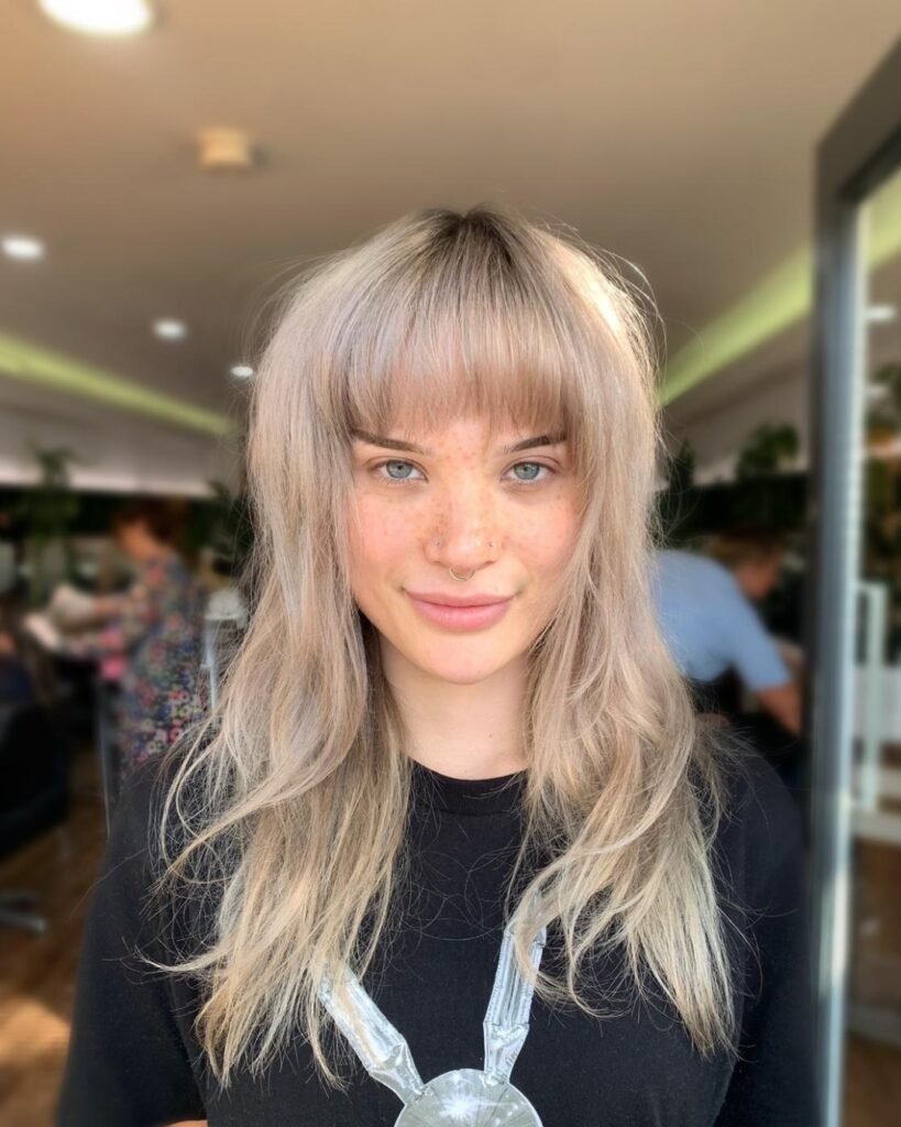 This image showcases a striking blonde Octopus Cut. The hair transitions from darker roots to a light blonde, adding depth and dimension. The cut features the signature layered style of the Octopus Cut, with shorter layers at the top creating volume and longer, wispier layers cascading down. The addition of full bangs adds a bold, fashionable element to this contemporary hairstyle.