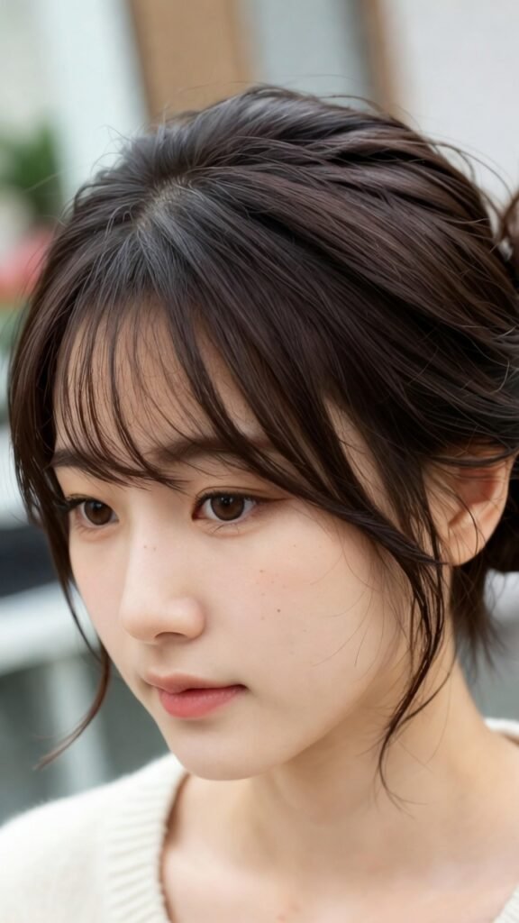 - Soft Curtain Bangs + Low Bun – Face-framing curtain bangs left loose, hair in a low bun.
