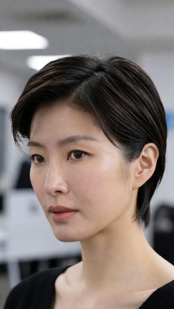 Slicked-back, textured pixie, or side-parted bob are all polished and professional.