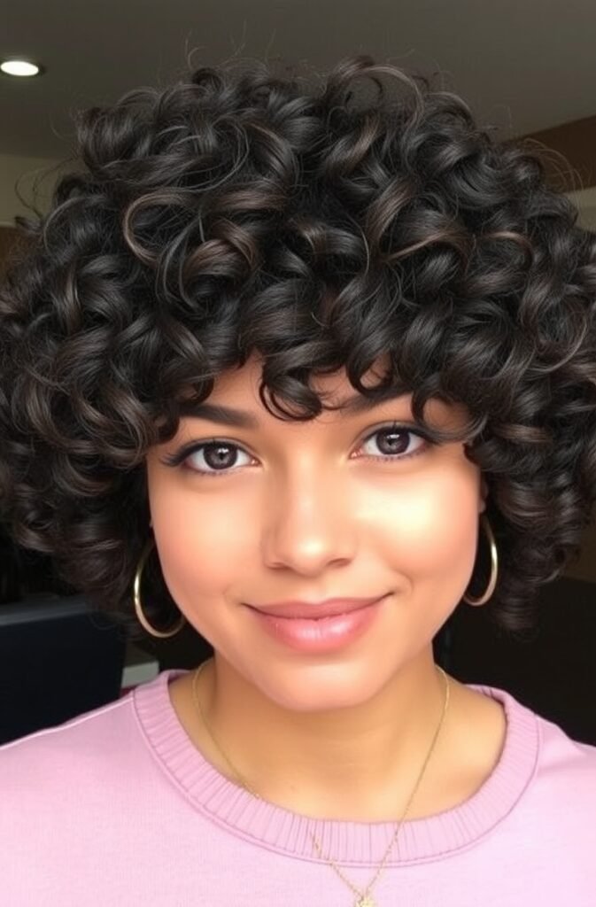 Designed for natural curls, this shag embraces volume and texture while keeping the shape defined. The baby bangs add a unique contrast, making the curls stand out even more. This cut is ideal for those with curly or coily hair, as it enhances the natural pattern. It’s a bold and stylish choice that requires minimal styling to maintain.