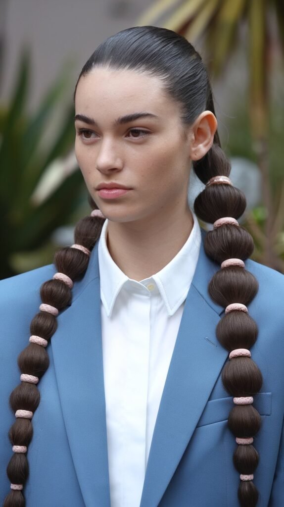 This playful style adds personality to your sleek ponytail by creating bubble-like sections using evenly spaced hair elastics. It’s bold, trendy, and easy to recreate for any hair length. The sleek base keeps it polished, while the bubbles add a fun, modern twist. Great for standing out with minimal effort.