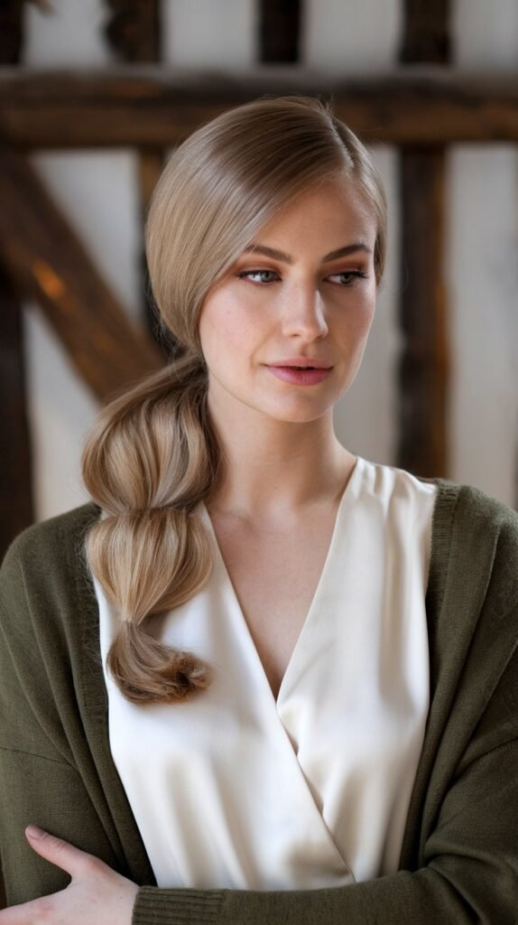 Add a soft, romantic flair to your look with a deep side part and a neatly brushed ponytail to one side. The asymmetry frames the face beautifully and gives a touch of elegance to a simple style. It’s sleek, graceful, and ideal for moments when you want to look effortlessly put-together.