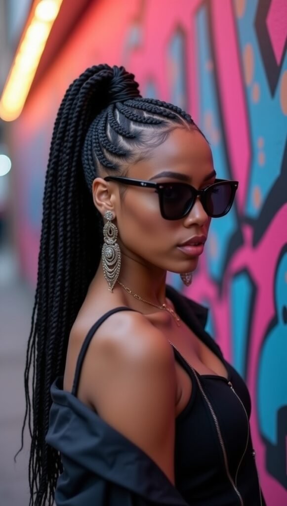 Elevate your sleek ponytail with cornrows or feed-in braids at the scalp for an intricate and trendy twist. The braids add texture and detail to the base while the ponytail stays smooth and polished. It’s a great way to mix edgy elements with a refined finish, making the look uniquely your own.