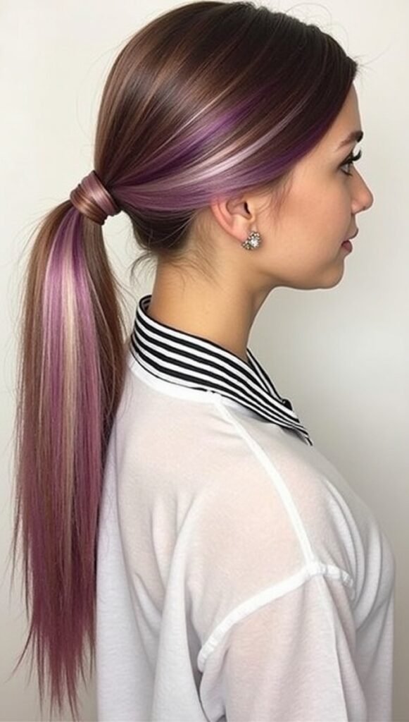 Add a creative twist to your sleek ponytail by incorporating dual-tone colors, like highlights or temporary hair dye. The contrast in colors adds depth and dimension, making the ponytail stand out even more. This bold style is perfect for anyone looking to make a statement or add a fun, artistic touch to their look.