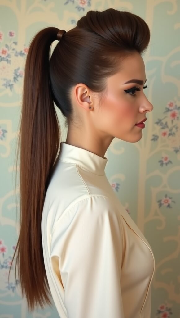 For a retro-inspired twist, add subtle volume at the crown with some teasing or a bump insert. The lifted base creates an elegant silhouette, adding height and sophistication to your sleek ponytail. This look channels classic 60s glam while staying fresh and modern.