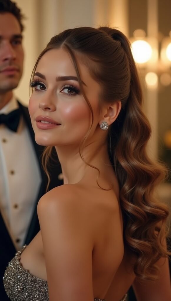 This style keeps the ponytail sleek at the top with smooth, straight hair, then adds soft curls to the ends for a glamorous, polished look. The contrast between the sleek base and voluminous curls creates a stunning, effortless finish. It’s the perfect combination of sophistication and fun.
