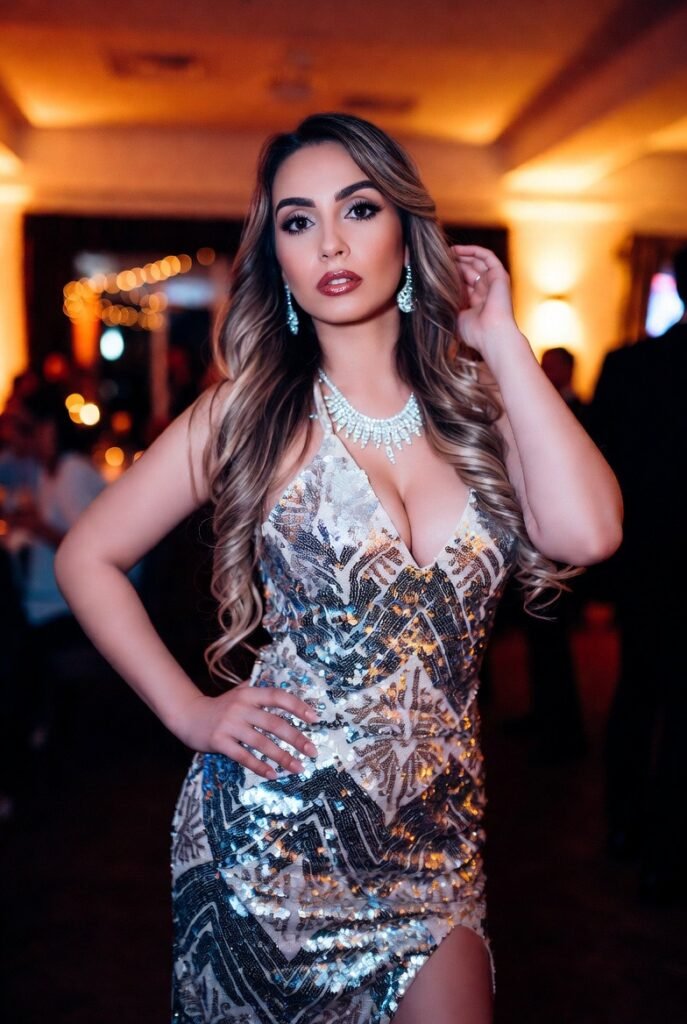 - Liquid Silver Sequin Gown with Thigh-High Slit – Floor-length but with movement; silver reflects every light.
