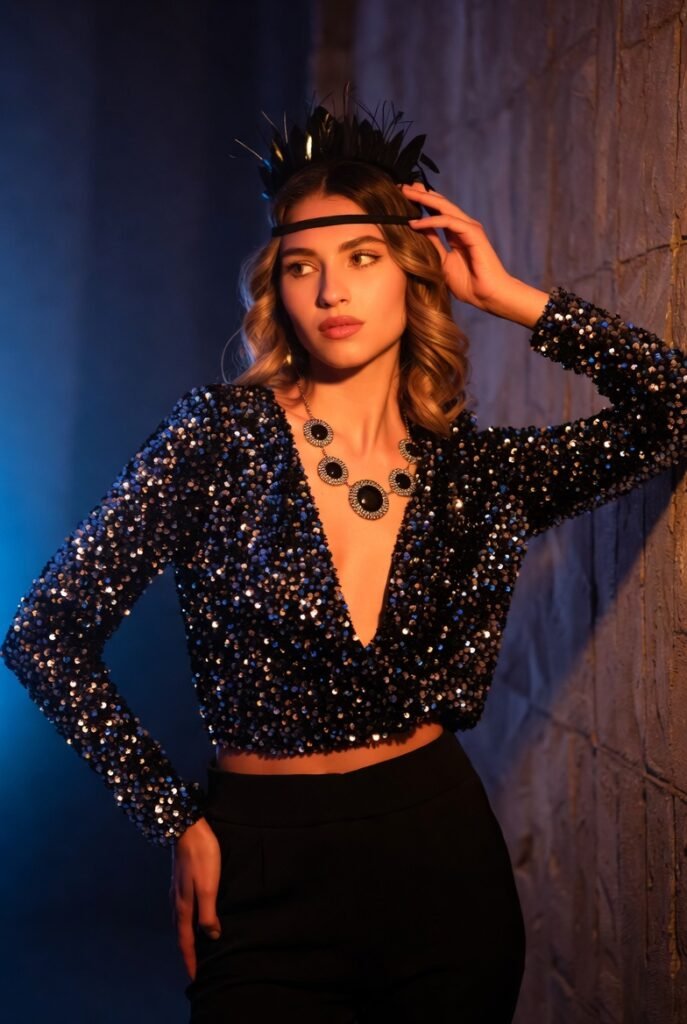 - Black Sequin Blazer + Matching Shorts Set – Tailored sparkle; add sheer tights for warmth.