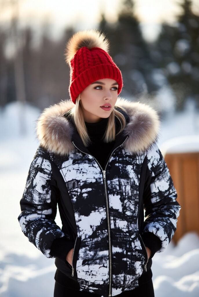 - Floral or Abstract Prints — Artistic all-over print suit with coordinating gloves and beanie for playful personality.