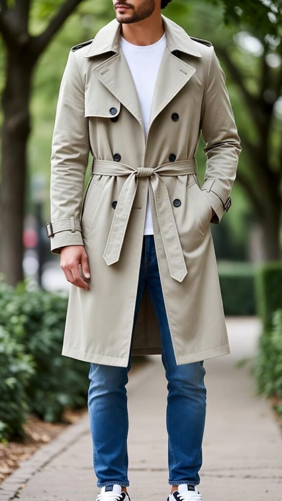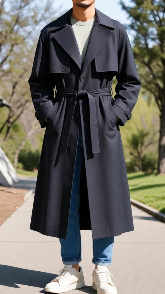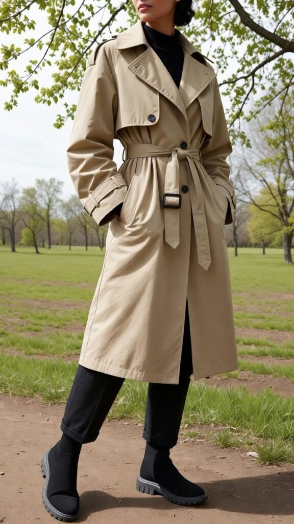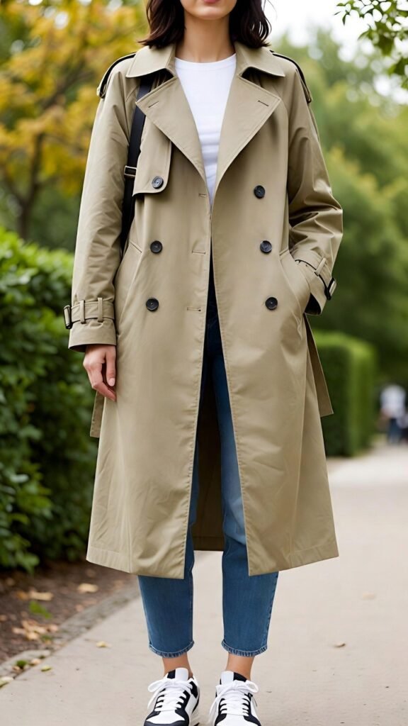 - Trench + Joggers + Chunky Sneakers – Elevated athleisure with trench coat.